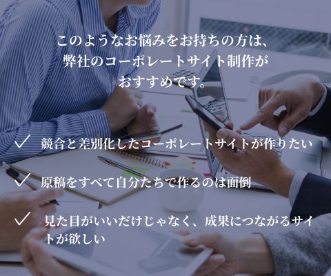 コーポレートサイトは、ウェブ上の企業の顔であると共に、御社の魅力や強みを表現する場所です。単なる情報の羅列ではなく、見る人を惹きつける企画力や、マーケティングの知識によって、ウェブサイトの効果や役割を高めることができます。弊社のコーポレート制作には、以下のような特徴があります。